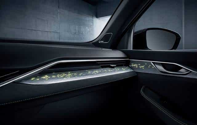 内饰部分,这辆时空版车型的整体内饰造型没有变化,和普通版的差别也是在于配色上。在座椅车顶等位置增加了Alcantara材质的包裹,而最抢眼的是中控台副驾一侧空调出风口下部的装饰板使用了被称为“星河镭雕”3D设计的装饰,视觉效果非常炫酷。