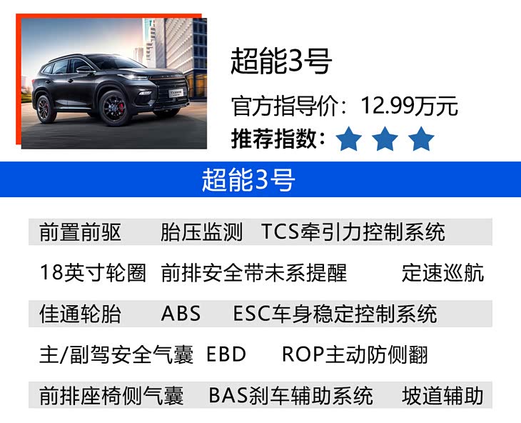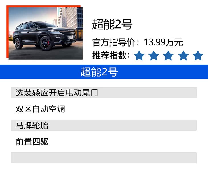 而在此次推荐购买的超能2号车型上,更是融入了19英寸轮圈、6喇叭扬声器、前排遮阳板带化妆镜照明灯等,性价比相对于超能3号来说更高。