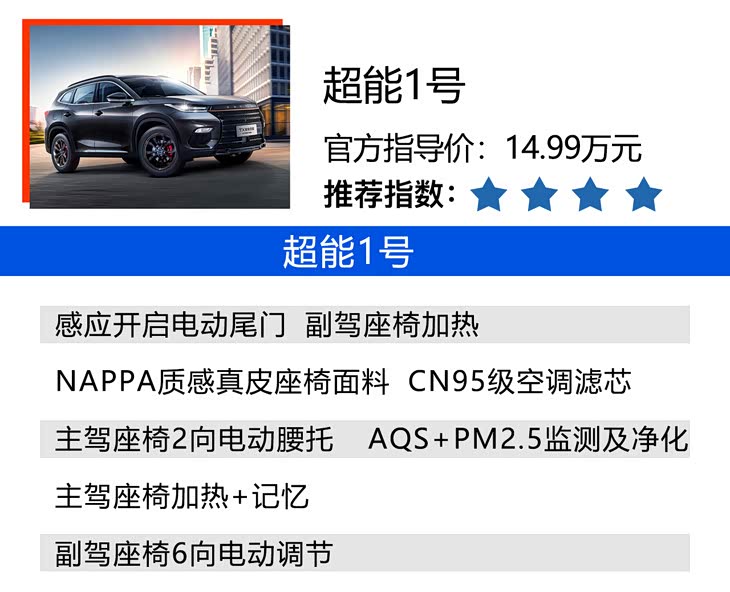 在顶配车型的超能1号上,还有感应开启电动尾门、NAPPA质感真皮座椅面料、主驾座椅2向电动腰托、主驾座椅加热+记忆、副驾座椅6向电动调节、副驾座椅加热、CN95级空调滤芯以及AQS+PM2.5监测及净化配置。虽然说超能1号在配置上来说更为丰富,但综合其售价已经配置的实用性来说,性价比并不是太高。
