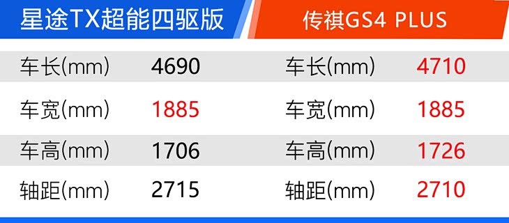 而新车的上市,将其竞争对手锁定在了传祺GS4 PLUS车型上。对比双车尺寸,星途TX超能四驱版车型的车身尺寸分别为4690、1885和1706mm,轴距为2715mm。而对标车型,传祺GS4 PLUS的车身尺寸分别为4710、1885和1726mm,轴距为2710mm。