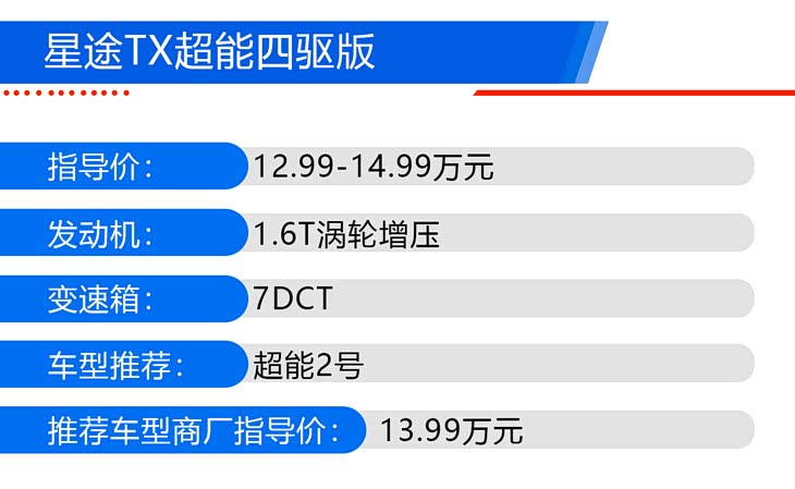 今日,全新 星途TX超能四驱版正式上市,新车共推出了3款车型供消费者选择。新车正式上市后,行车视线第一时间对新车的售价以及配置进行综合分析,为各位消费者推荐出超能2号版车型为性价比最高的车型。