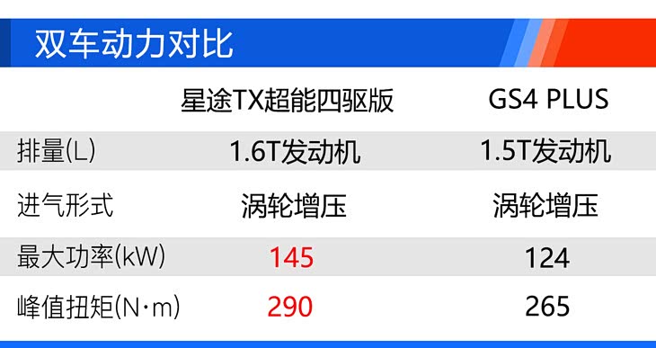 动力系统上,星途TX超能四驱版车型搭载的是1.6T涡轮增压发动机,最大输出功率为145kW,峰值扭矩为290Nm。而传祺GS4 PLUS车型搭载的是一台1.5T涡轮增压发动机,最大输出功率为124kW,峰值扭矩为265Nm。