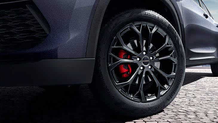 来到车身侧面,新车的线条设计流畅,并且展现出较为饱满的视觉效果。同时,新车还配备了铝合金轮圈,内部还有红色刹车卡钳进行点缀,运动质感显著。