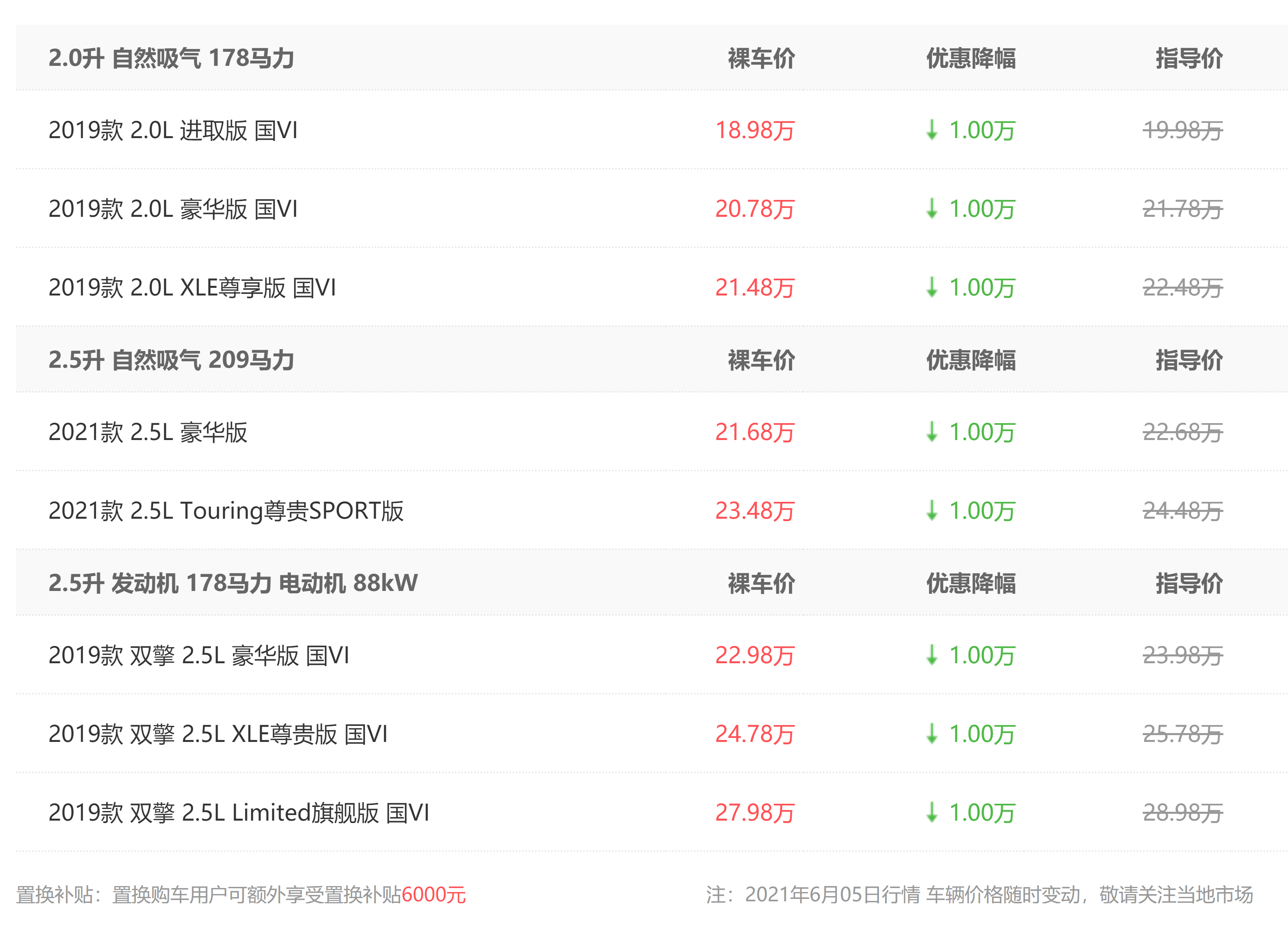 在6月5日,北京地区某经销商公布了丰田亚洲龙的优惠情况,最高优惠金额可达1万元。另外还有6000元的置换补贴。优惠后裸车售价最低的车型是2019款 2.0L 进取版,其裸车售价可降低至18.98万元。具体优惠情况如下图所示。目前这样的优惠力度看起来不是太高,好在经销商也没有公布其他的优惠附加条件,但具体情况还是要以店内为准。