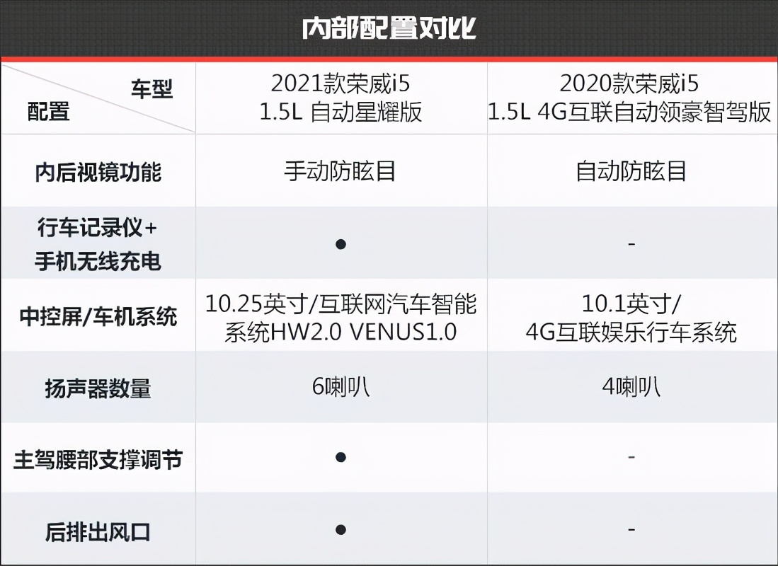 除了取消了车内后视镜的自动防炫目外,2021款荣威i5的内部配置也进行了大幅升级。除上述车用发动机系统外,新车型还增加了内置行车记录仪、手机无线充电、驾驶员腰部支撑调节和后排气口,音响系统的扬声器数量也增加到了6个,多媒体系统和舒适性也有了明显的提高。