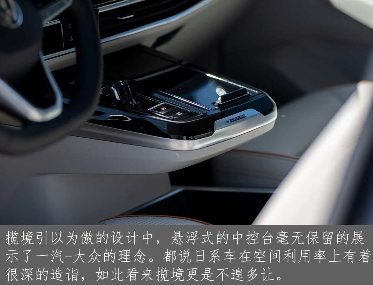 这种实用性的细节在揽境上面比比皆是,一汽-大众是最懂得权衡不同车型利与弊的车企。我相信,集团内部在开发揽境这款产品时,工程师一定没有和设计师脸红脖子粗的吵上一架,因为车辆的细节表明了开发人员的意见统一。