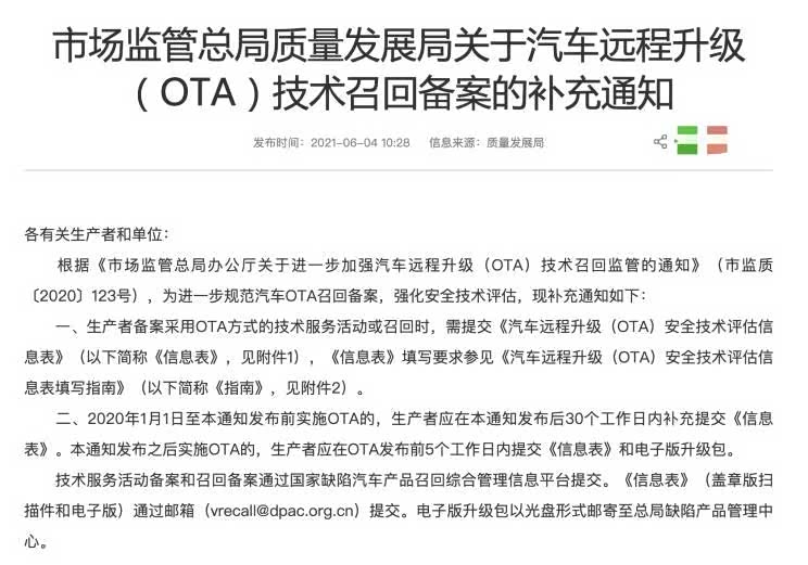 其实早在2020年11月,国家市场监督管理总局就发布了进一步加强汽车远程升级(OTA)技术召回监管的通知。当时通知要求,所有采用OTA方式对已售车辆开展技术服务活动的生产者,都应按照《缺陷汽车产品召回管理条例》及《缺陷汽车产品召回管理条例实施办法》的要求,向市场监管总局质量发展局备案。对于采用OTA方式消除汽车产品缺陷、实施召回的行为,生产者也应制定召回计划,向市场监管总局质量发展局备案,依法履行召回主体责任。同时,当车辆在中国市场发生被入侵、远程控制等安全事故时,生产者应立即组织调查分析,并向市场监管总局质量发展局报告调查分析结果。