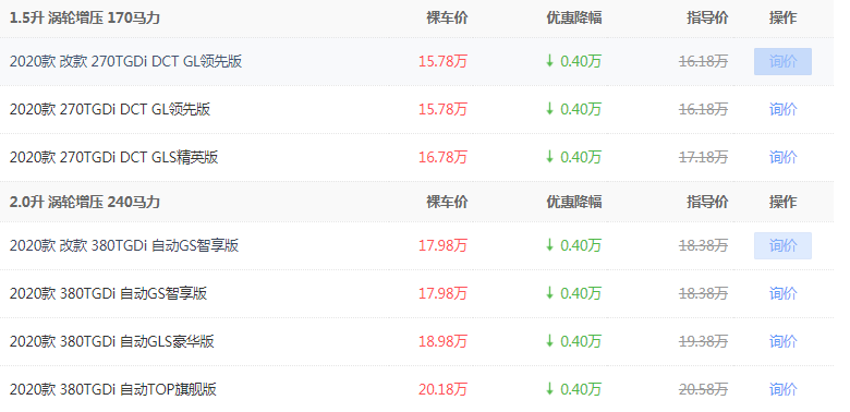 汽车提供的是1.5T、2.0T发动机,传动上匹配的是7挡干式双离合、8挡手自一体变速箱,最大输出功率分别为170马力、240马力,动力上输出很强劲。