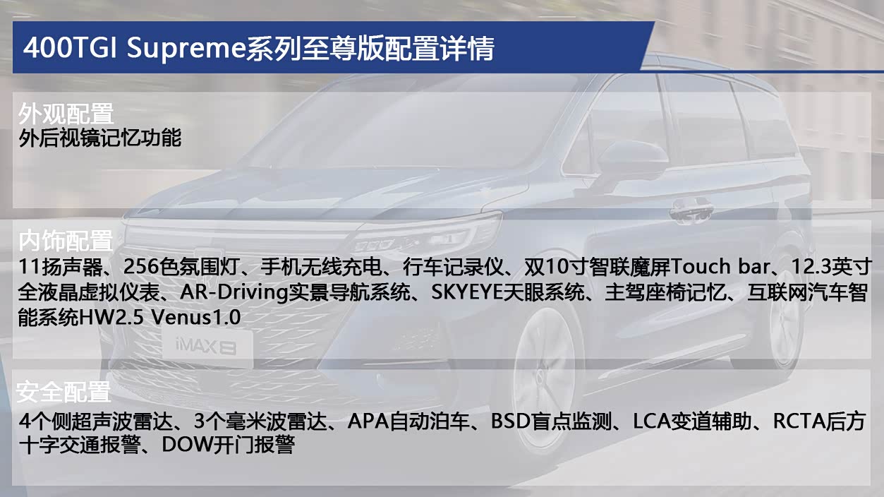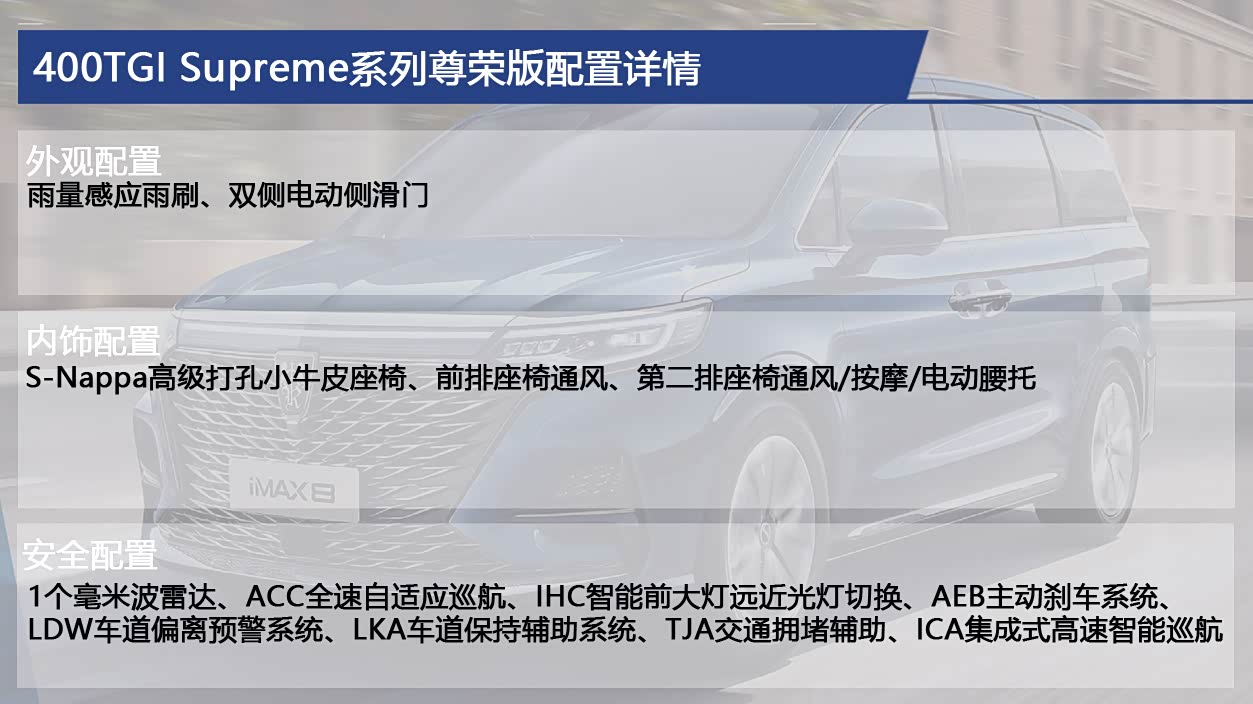 在荣威iMAX8推出的4款车型中,我们重点推荐400TGI Supreme系列陆尊版,因为入门版的配置算是比较全面了,这款车升级的配置都很实用且有亮点,新增智能移动魔吧、感应电动尾门、360度全景影像、LWC盲区显示、全舱交互式语音控制、前排座椅加热、第二排座椅加热、副驾驶电动调节等,舒适性、安全性和科技性都得到提升,价格控制在20万出头,整体性价比高,值得重点推荐。