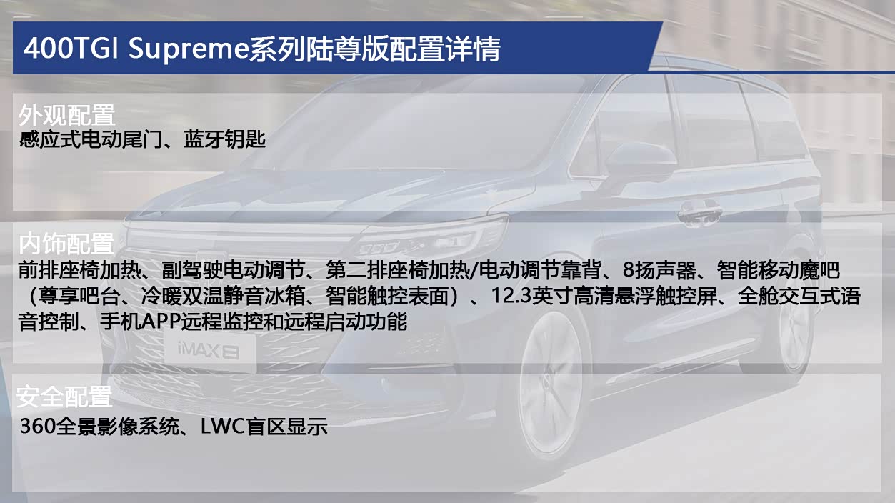 400TGI Supreme系列陆尊版在入门版基础上增加1.5万,重点升级舒适性和科技性配置,像新增前排座椅加热、第二排座椅加热、副驾驶电动调节、感应电动尾门、12.3英寸中控屏、全舱交互式语音控制等,都是非常实在的功能升级。更关键的是新增智能移动魔吧,可谓是茶水饮料一应俱全,老人小孩的需求都可以照顾到。360度全景影像和LWC盲区显示也是实用性非常强的安全配置,这款车的配置提升非常明显,是我们此次重点推荐的车型。