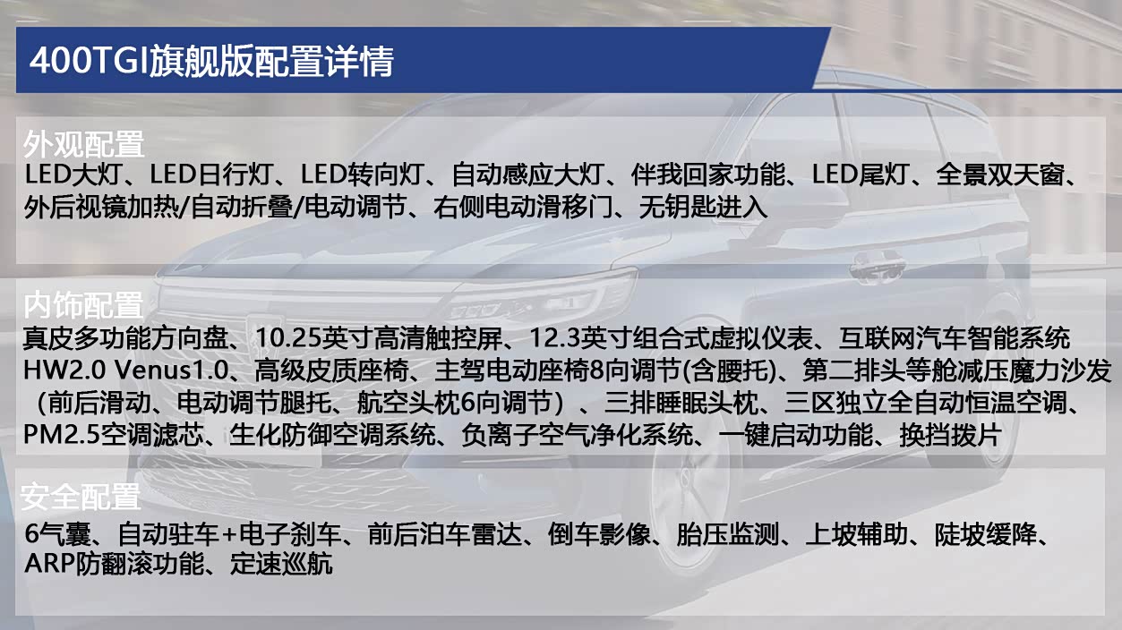 作为入门版车型,400TGI旗舰版的配置并不低,拥有像全景双天窗、三区自动空调、生化防御空调系统、负离子空气净化系统、PM2.5空调滤芯、主驾8向电动调节、第二排头等舱减压魔力座椅、三排睡眠头枕、右侧电动侧滑门等多项舒适性配置,作为一款MPV车型来说,还是够用的。12.3英寸仪表盘+10.25英寸中控屏的组合,也能满足大部分用户对多媒体系统的需求。安全配置比较常规,但也配备6气囊、倒车影像、胎压监测、定速续航等功能。如果对驾驶辅助系统要求不高的话,这款入门版车型还是比较推荐的。
