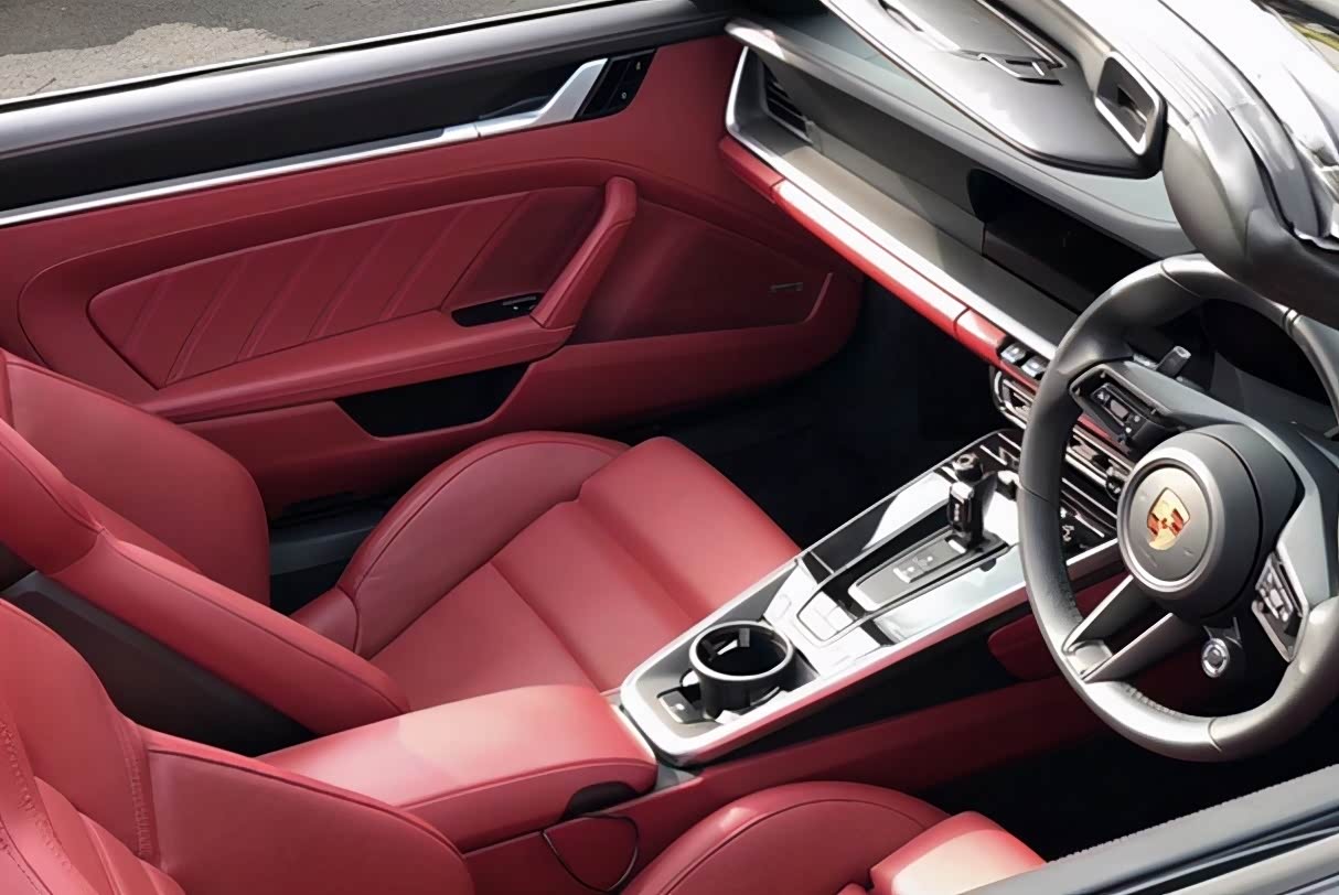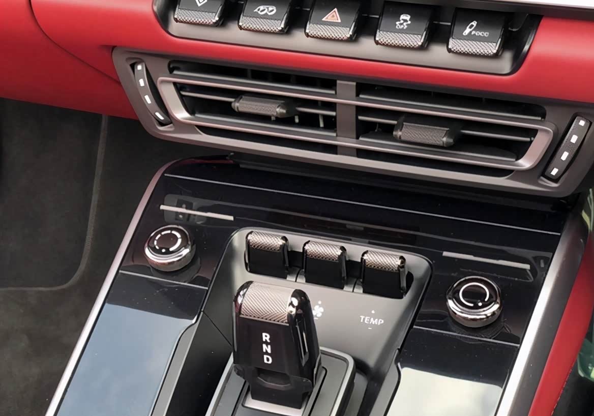 坐进车内,新车内饰采用红/黑配色,配备三幅式多功能方向盘,所以看起来非常修长。值得说明的是,新车电子档把周围还采用了亮黑色面板修饰,视觉感受上更显精致与豪华。一体式运动座椅被红色皮革包裹,搭配“Turbo S”标识,专属氛围还是相当不错的。