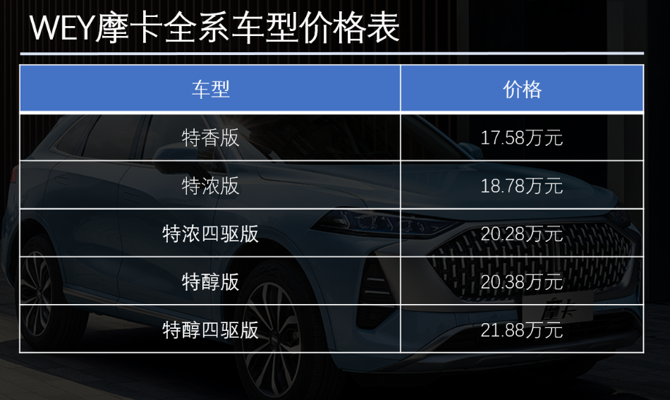 作为WEY品牌的全新旗舰车型,WEY 摩卡在今年的5月21日正式上市的,定位于中型SUV,五款车型的售价区间为17.58万到21.88万。相比此前WEY品牌的旗舰车型VV7,WEY摩卡在外观和内饰方面升级明显,那么作为新旗舰车型,WEY摩卡到底相比VV7有那些方面的升级呢?日前驾享慢生活来到了WEY品牌的上海一家授权经销商店,来看一看WEY摩卡究竟是如何靠实力上位的。