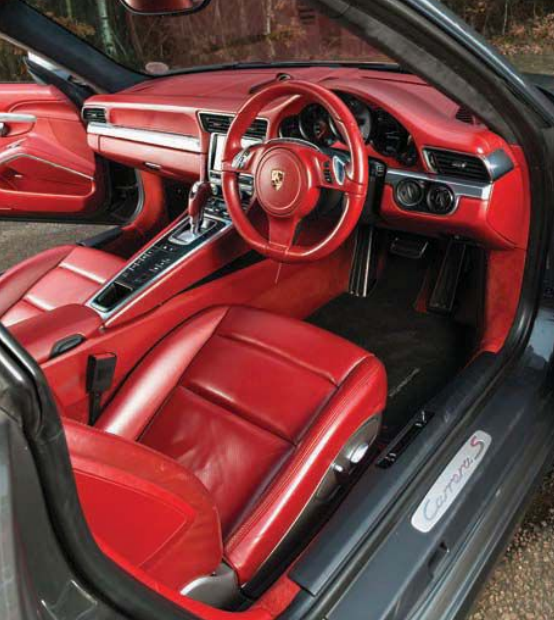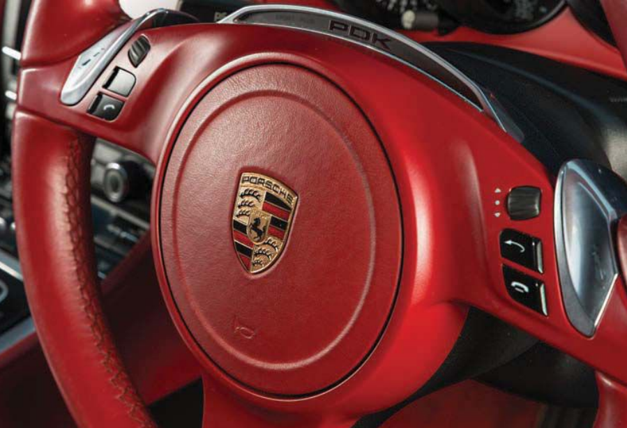 越来越多的保时捷车迷对于保时捷的喜爱已经不能仅仅从速度和操控着手了,所以,越来越多的鲜艳内饰配色出现在了经典的保时捷911车型上面,这台车子就选配了大红色的真皮包裹,审美条件不同,我个人不是太能接受这种大红的内饰配色。当然,方向盘上的PDK换挡拨片,金属踏板,镀铬内饰条等等一系列的内饰配置,都必须花费巨资进行选配才能获得。