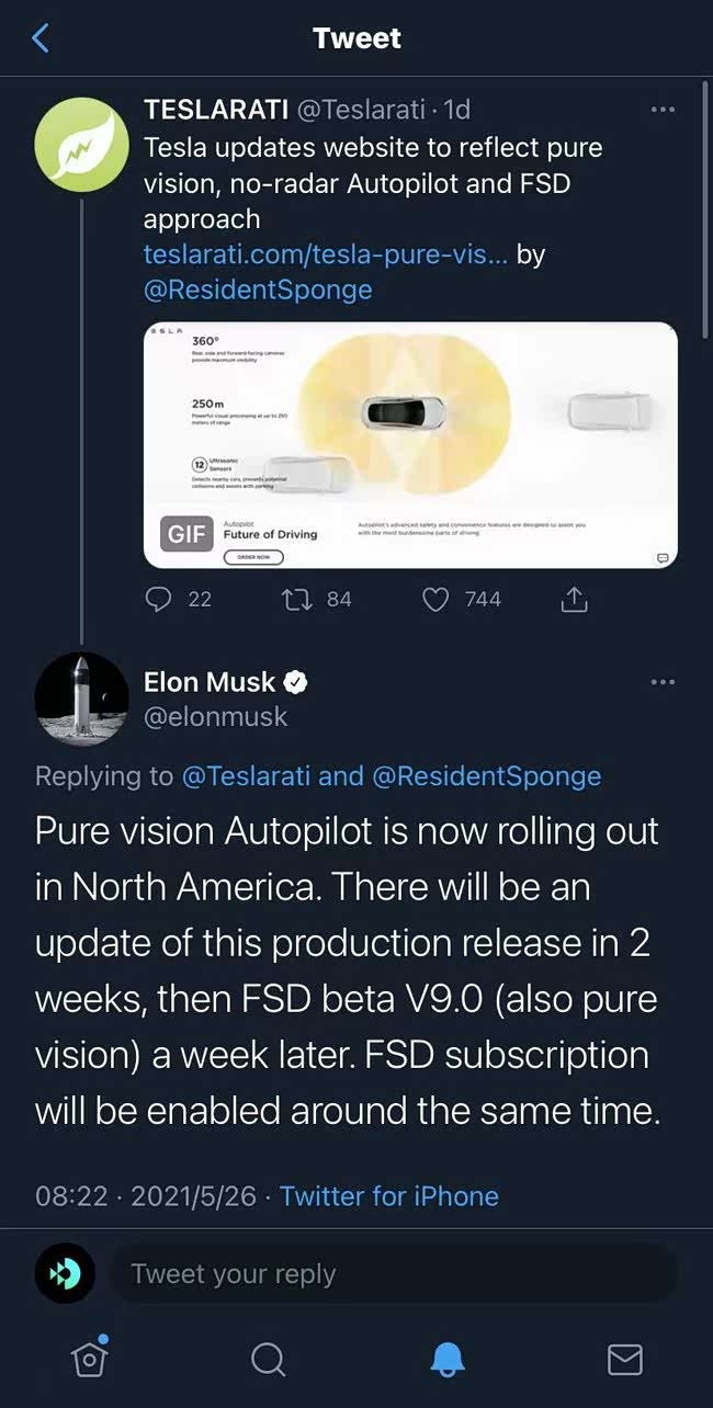 近日,特斯拉对外宣布,从5月份开始,北美市场的Model 3和Model Y将不再配备雷达传感器,取消车前方的毫米波雷达,仅使用摄像头作为自动驾驶系统的信息采集,这意味着特斯拉即将成为真正意义上第一个在量产车上实现“纯视觉”自动驾驶方案的车企。
