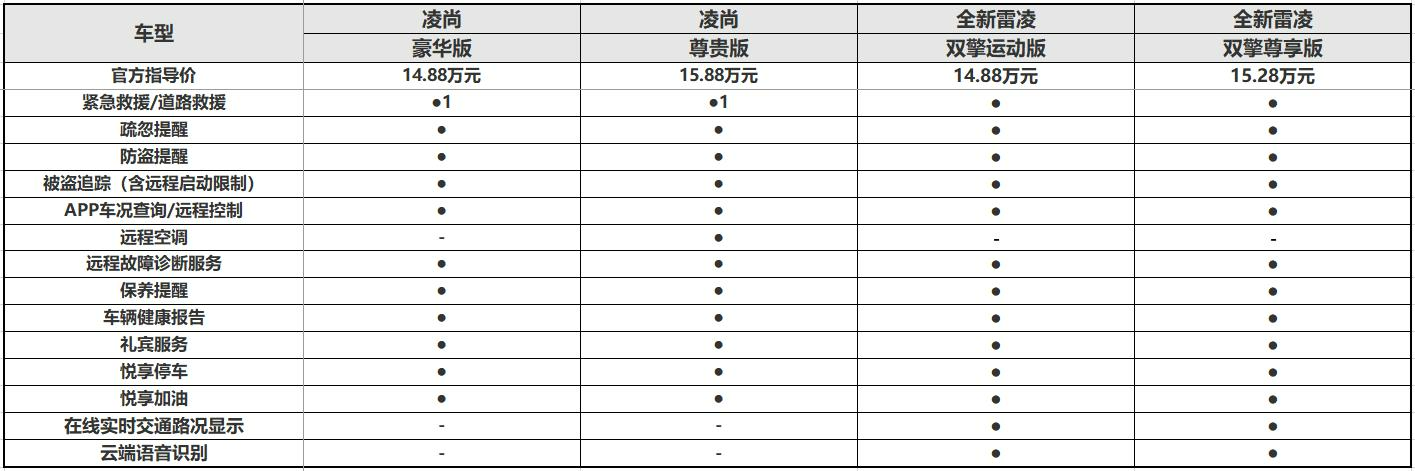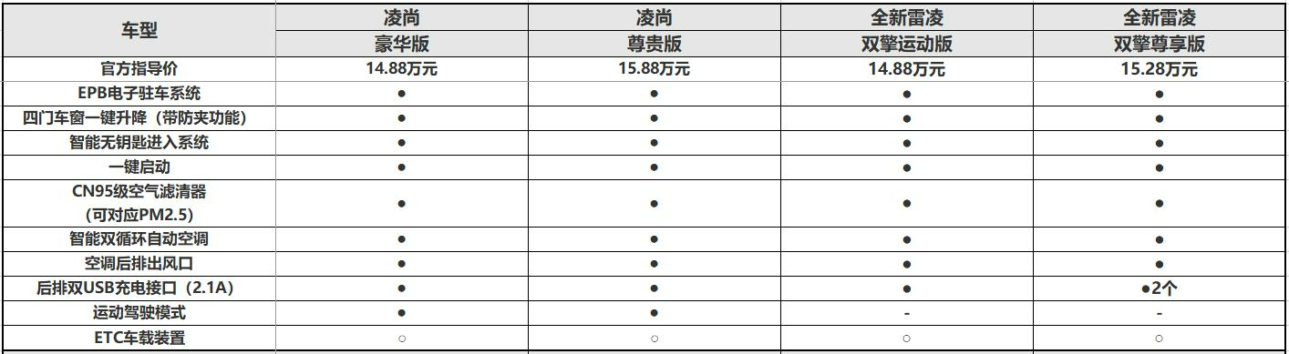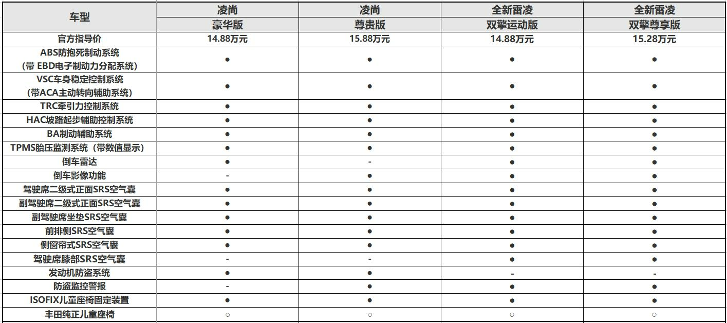 从前面的几个方面来看,凌尚和雷凌真的很相近,可谓长得差不多、动力底盘差不多、尺寸也差不多,就连价格也差不多。如果要是配置也差不多,那可就尴尬了。为此我们特意将凌尚豪华版/尊贵版和雷凌双擎运动版/尊享版进行对比,看看有何差别。