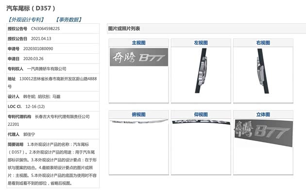 日前,我们从国家知识产权局获得了一组奔腾新车型的专利图,新车代号命名为“D357”,结合此前申报的“B77”尾标设计,由此判断奔腾B70将接着小改款的契机,顺带更名为B77,与一汽奔腾推行的新命名规则相符合。