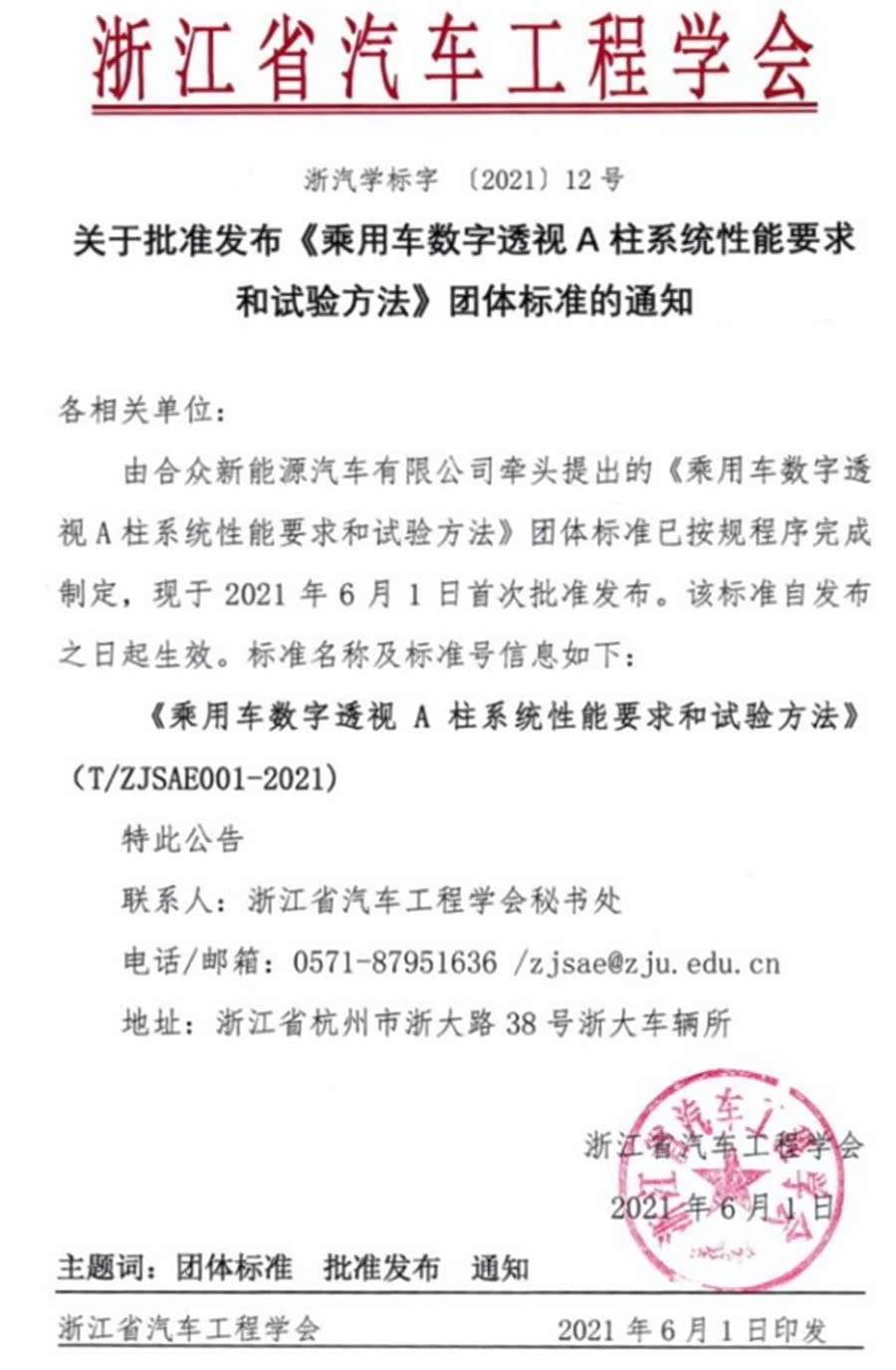 日前,由合众新能源汽车有限公司提出的《乘用车数字透视A柱系统性能要求和试验方法》已按程序完成制定,于6月1日首次批准发布并开始生效。《标准》从各方面对透视A柱相关技术标准进行了系统考量,并对标准名称、术语定义、技术要求、试验方法进行了详细规范。