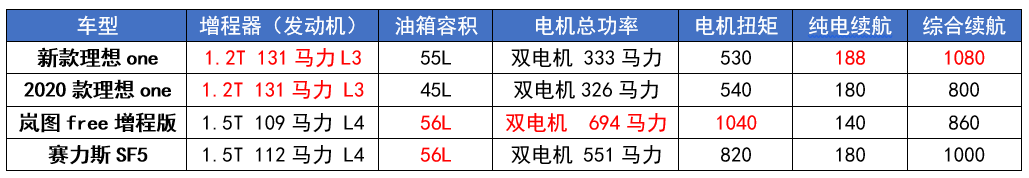 增程器和电机上也是颇有看点,新款理想one延续了旧款的1.2T三缸增程器,虽是排量小又不受待见的三缸发动机,但是在动力参数在一众增程器中属于较强的水平。电机性能比起岚图free和赛力斯SF5确实要略逊一筹,在油箱大小相近的情况下,要性能还是要续航,就得看消费者怎么选择了。