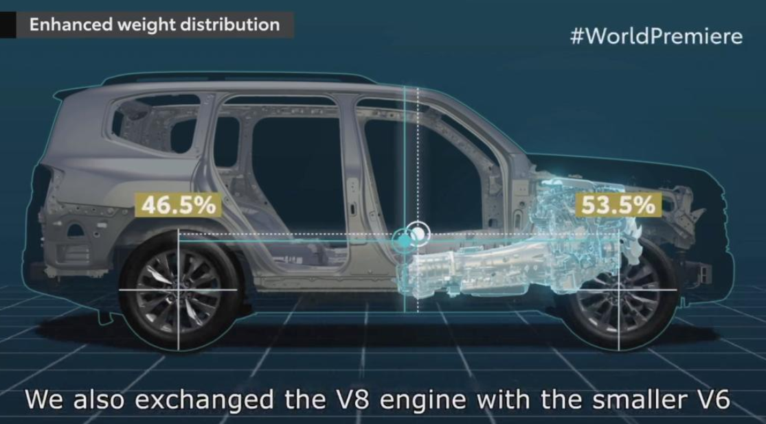 据悉,为了得到更好的操控体验,新车将发动机的摆放位置相较LC200向后缩了70mm,高度降低了28mm,使得车身重心降低的同时前后配重比也更加接近50:50的黄金比例(53.5:46.5)。