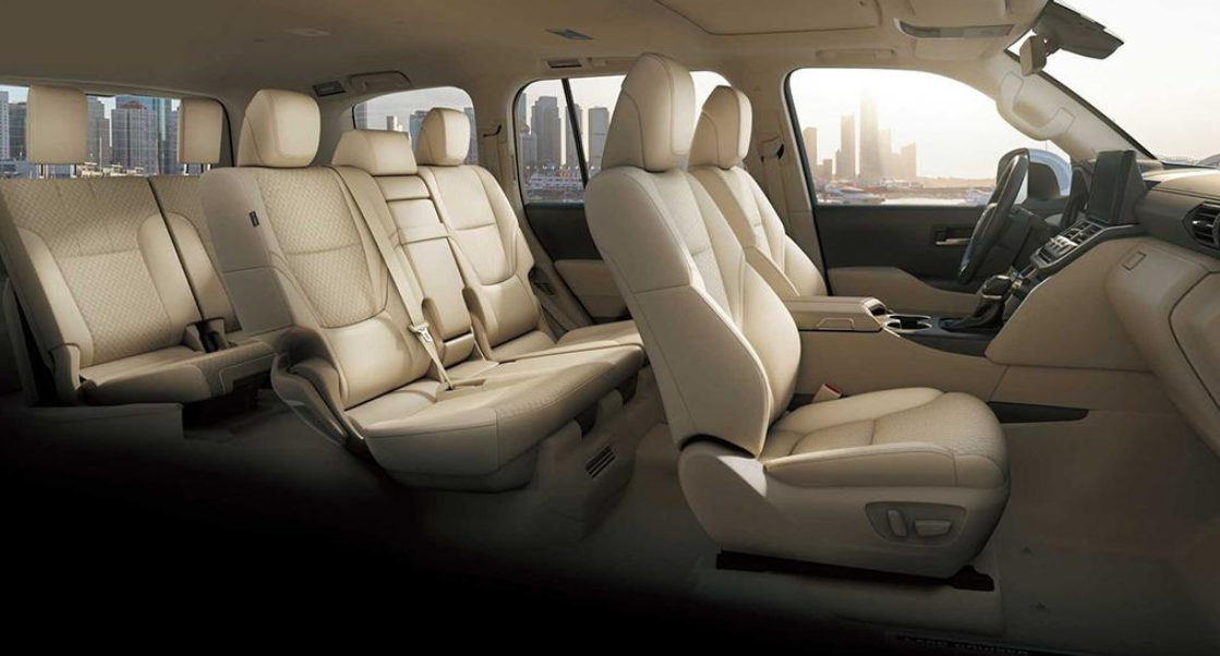 座椅方面,全新LC采用了2-3-2的布局形式,值得称赞的是,第三排座椅放倒后,可以完全收纳在地板下,不会占用后备厢空间。