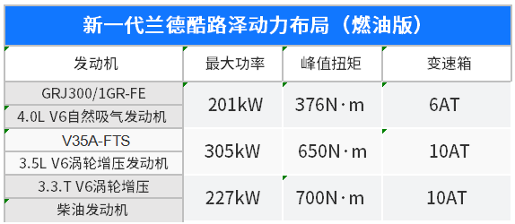 全新LC将提供三种动力,分别为4.0L V6自然吸气发动机、3.5T V6涡轮增压发动机以及一台3.3T V6柴油发动机;其中4.0L发动机代号为GRJ300/1GR-FE,最大功率201kW,峰值扭矩376N·m;3.5T发动机代号为V35A-FTS,最大功率最大功率305kW,峰值扭矩650N·m;3.3T柴油发动机最大功率227kW,峰值扭矩700N·m。传动系统方面,与发动机匹配10AT或6AT变速箱。