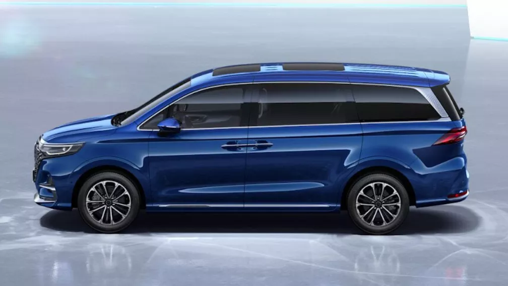 荣威iMAX8车身侧面,流畅的长线条贯穿整个车身,A柱、D柱与车顶融为一体,并对B柱、C柱做熏黑处理,营造出悬浮车顶的效果。
