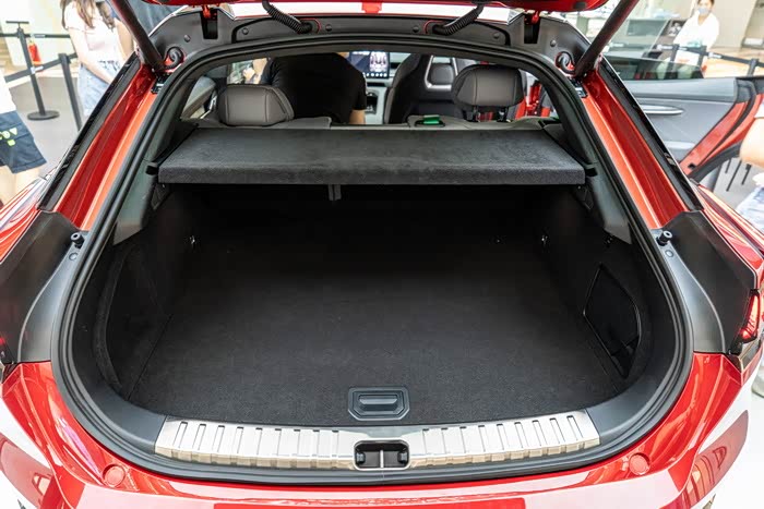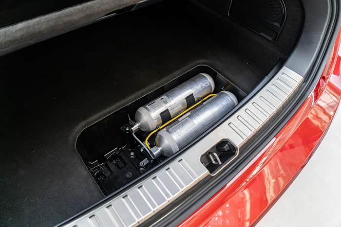 空气弹簧的气罐藏在盖板下部,如果没有选配空气悬架,这里应该会也做成一个大储物槽。
