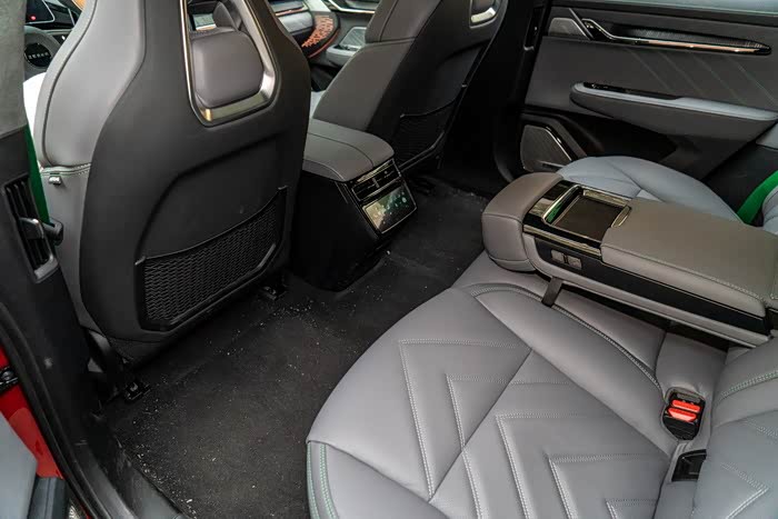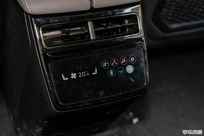 后排空调出风口除了中间2个以外,在左右B柱上也各有1个。如果选装智能恒温空调套装,后排就可以增加一个独立的触控屏、三温区空调和三种香型的香氛系统,价格同样为6000元。