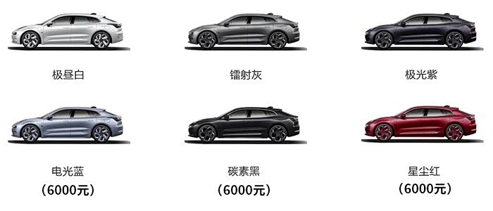 共有6种外观颜色,电光蓝、碳素黑、星辰红需要加6000元选装,而黑色车顶则需要加2000元。在12月31日前支付定金的用户,不论配置,均可以免费升级电光蓝配色。