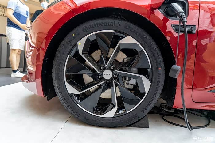 展车配备21英寸的「弧光幻影轮毂」,搭配255/45 R21的马牌CPC6轮胎,内侧胎面带有ContiSeal™自修补涂层,该轮胎需要花3000元选装。而普通版本的轮胎尺寸相同,花纹为固特异EAGLE F1 AS3 SUV系列。