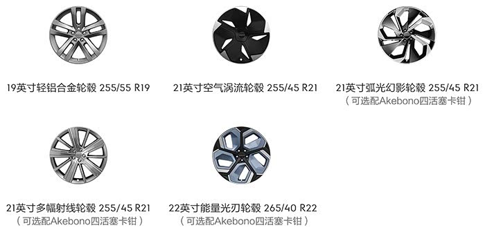 目前低配的两款WE版车型也可以免费升级21英寸轮毂,而Akebono四活塞卡钳需加5000元选装。