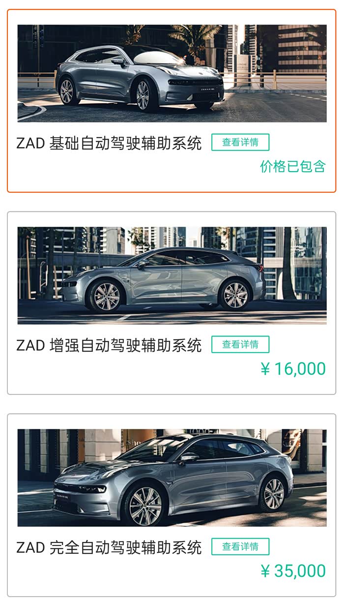 极氪001将辅助驾驶分为了三个等级,标配的ZAD基础自动驾驶辅助系统包含ACC自适应巡航和LKA车道保持,另外两个高级版本则需要另外选装。