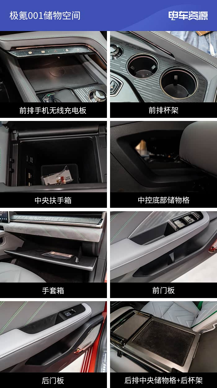 极氪001的储物空间表现还不错,大小物品都能找到合适的位置存放,并且基本都配备有防滑垫或者植绒处理。就是中控底部的储物格开口稍微靠后了一点,基本被座椅挡住了一半,前半部又被腿挡住了,取放东西都不算方便。