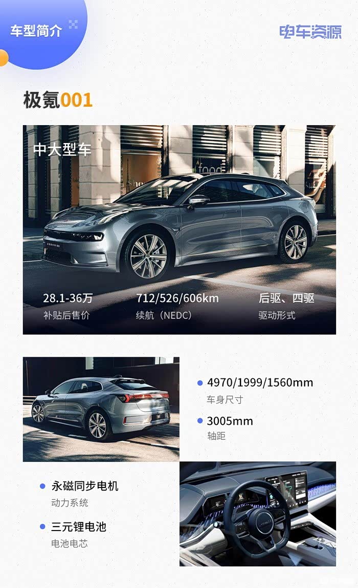 极氪001的配置分布比较简单,有单电机和双电机两个版本、三款配置,分别是: