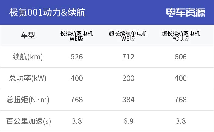 极氪001的配置分布非常清晰,两款WE版本就是动力或续航二选一,YOU版本就是「我全都要」。