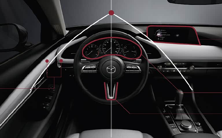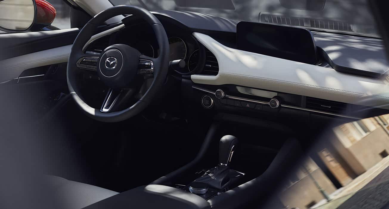 接着来看看昂克赛拉的方向盘,昂克赛拉的整个驾驶位就十分有设计感,方向盘采用丁字形设计,仪表盘的线条也十分流线。