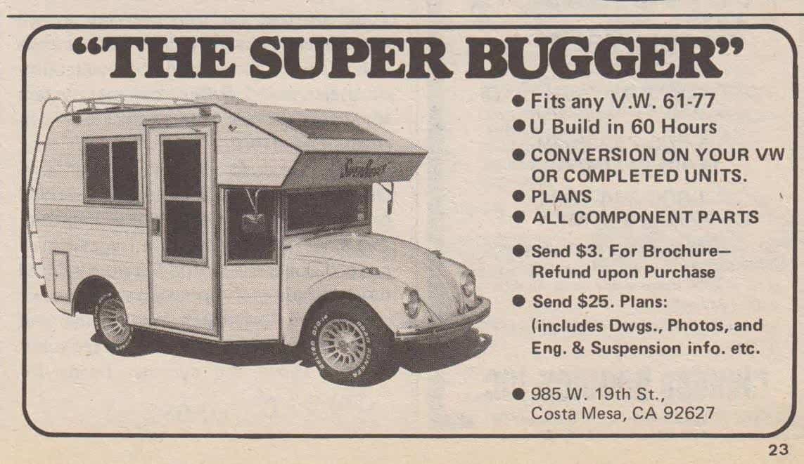 直到20世纪80年代,人们仍在用甲壳虫汽车改造属于自己的“超级大坏蛋”。由于对汽车改装的工程要求越来越严格,如今进行这样的改装在大多数地区很有可能是非法的,然而,在当时那个时代改装甲壳虫为房车是没有问题的。