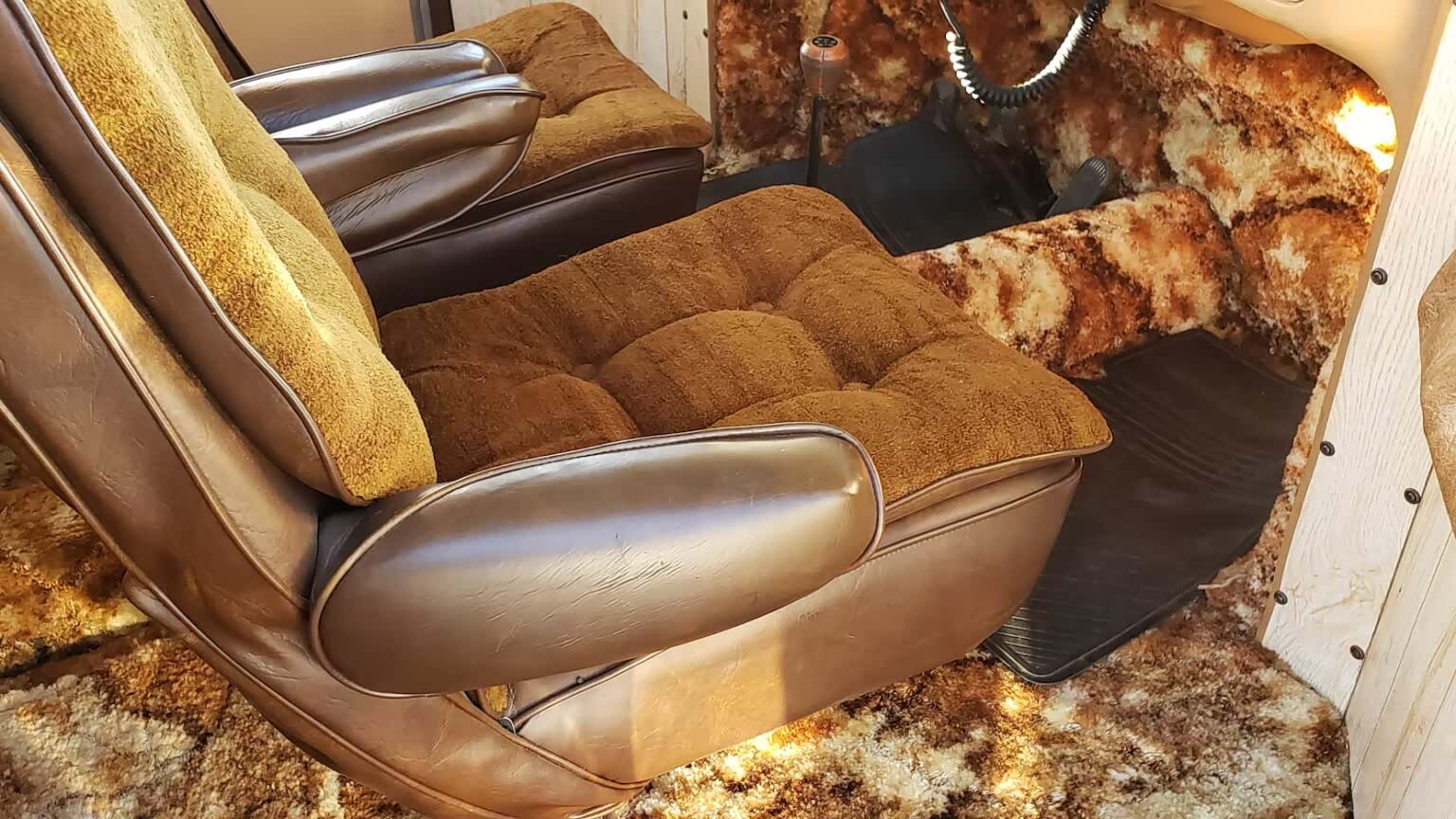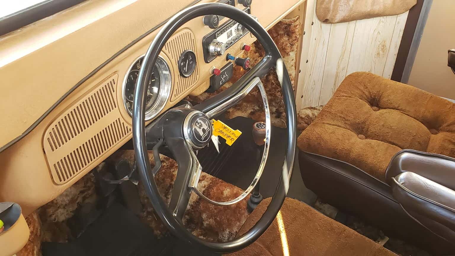 在建造过程中,为了稳定起见,使用了一套更宽的后轮胎,悬挂系统也进行了改装,以适应额外的重量。在车内,你会发现一个AM/FM 收音机,可以听广播节目消遣。整个70年代风格的地毯和配套的窗帘,甚至有一个曲柄天窗用于通风。