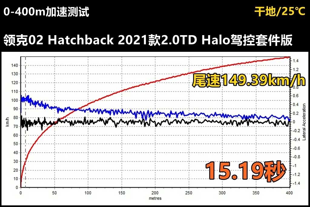 由于测试场地条件允许,我们还测试了两厢版领克02的四分之英里——也就是400米加速成绩,15.19秒,尾速达到149.39km/h。由于缺少对照,所以我们也不清楚这个数据是个什么样的水平,给大家看个新鲜罢了。