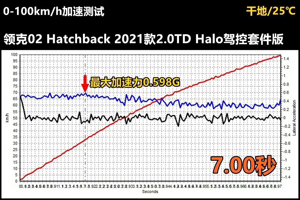 在5次0-100km/h加速测试中,两厢版领克02跑出了7.00秒的最快成绩,这个成绩和官方宣布的6.2秒差距较大——差距在0.3秒以内,我脆弱的内心是可以接受的,但差距超过0.5秒的时候,我会认为这款车动力虚标,因为我不认为官方的测试员能有本事把我甩这么多。此外就蓝色加速力输出曲线看,8AT变速箱调得还算不错,初段线性感很接近电动车。