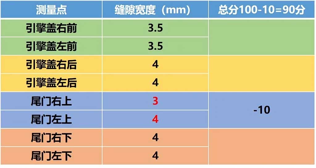 其实两厢版领克02引擎盖冲压形面不算复杂,所以引擎盖的钣金工艺挑不出骨头。而尾门上端左右有1mm误差,所以扣掉10分。整体上看,90分的钣金工艺也算不错了。