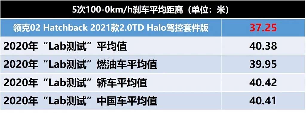 我们针对2020年测试过的所有车型,统计了各个细分市场的刹车表现平均数据,两厢版领克02的表现大大领先于所在的细分市场。