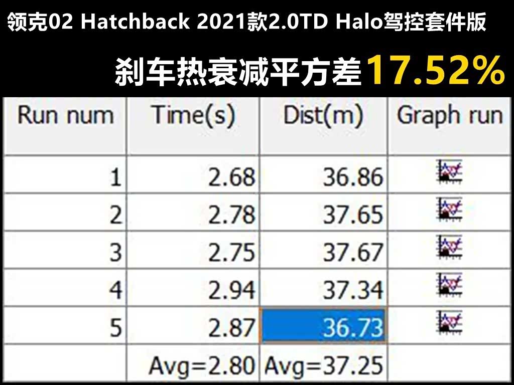 至于刹车,两厢版领克02表现得相当不错——5次100-0km/h刹车平均成绩为37.25米,最好成绩36.73米,刹车热衰减平方差低至17.52%——按照我们的分级,刹车热衰减平方差≤25%算完美,≤50%算优秀。