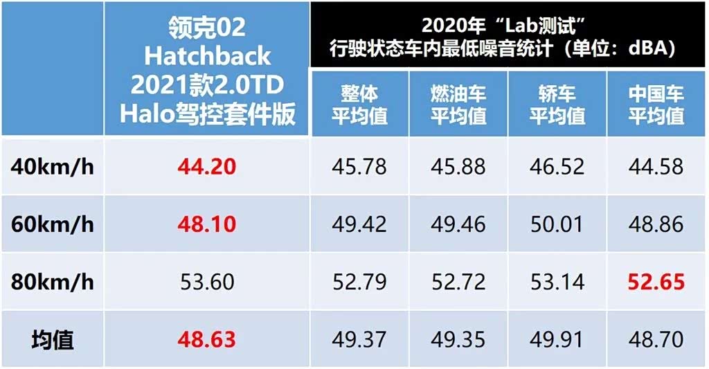 在40km/h、60km/h和80km/h匀速状态下,两厢版领克02车内最低噪音分别为44.2dBA、48.1dBA以及53.6dBA,三个速段的最低行驶噪音均值达到了48.63dBA。相比于2020年全年统计的“Lab测试”各细分市场平均成绩不难发现,两厢版领克02的整体静音表现还不错,甚至是有些出乎意料了——毕竟这是4条大嗓门的米其林PS4运动胎跑出来的成绩。