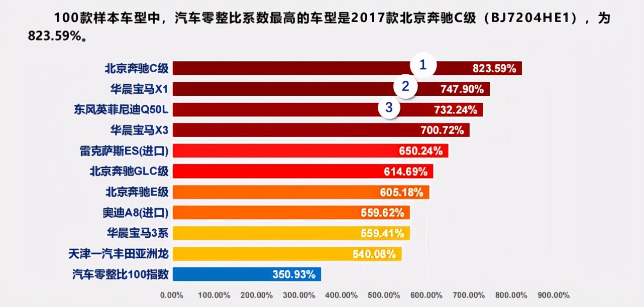 而看回到中保研的公布数据,首先是汽车零整比榜单,这100款车型的汽车零整比100指数为350.93%,不出意外,前十榜单大部分都是豪华品牌,其中北京奔驰C级最高为823.59%,占据首位,其后则是华晨宝马X1与东风英菲尼迪Q50L,比较出乎意料的是,一汽丰田亚洲龙也进入到前十。不过此前零整比较高的沃尔沃品牌并没有进入前十榜单。