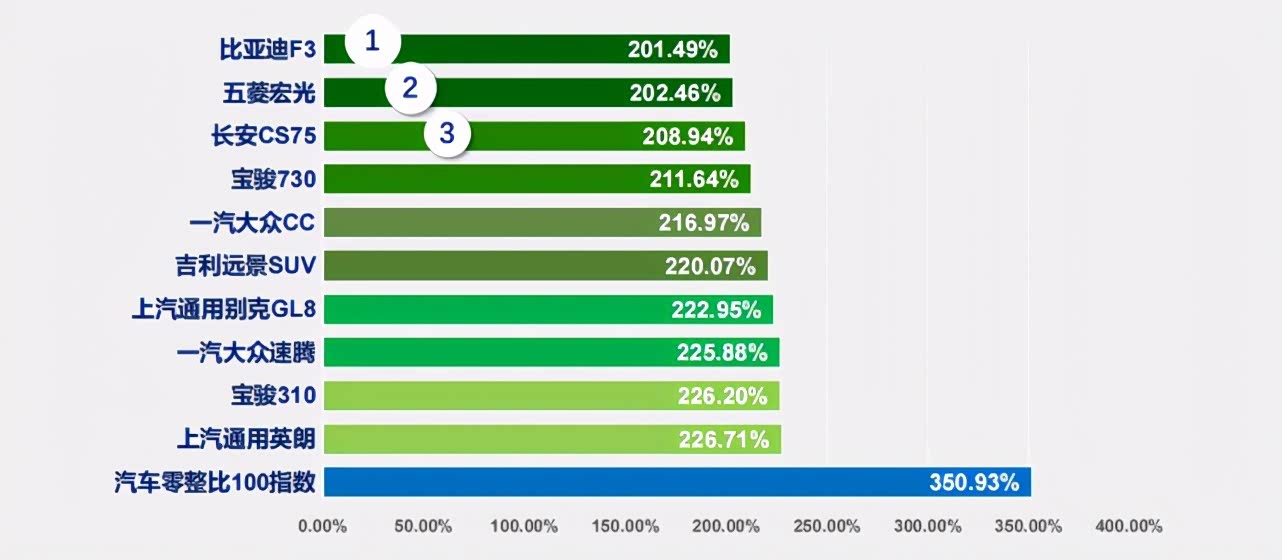 而比亚迪F3、五菱宏光、长安cs75则分别以201.49%、202.46%、208.94%成为最低零整比的前三名。惊喜的是,在最低零整比排行中,也有不少合资品牌身影。