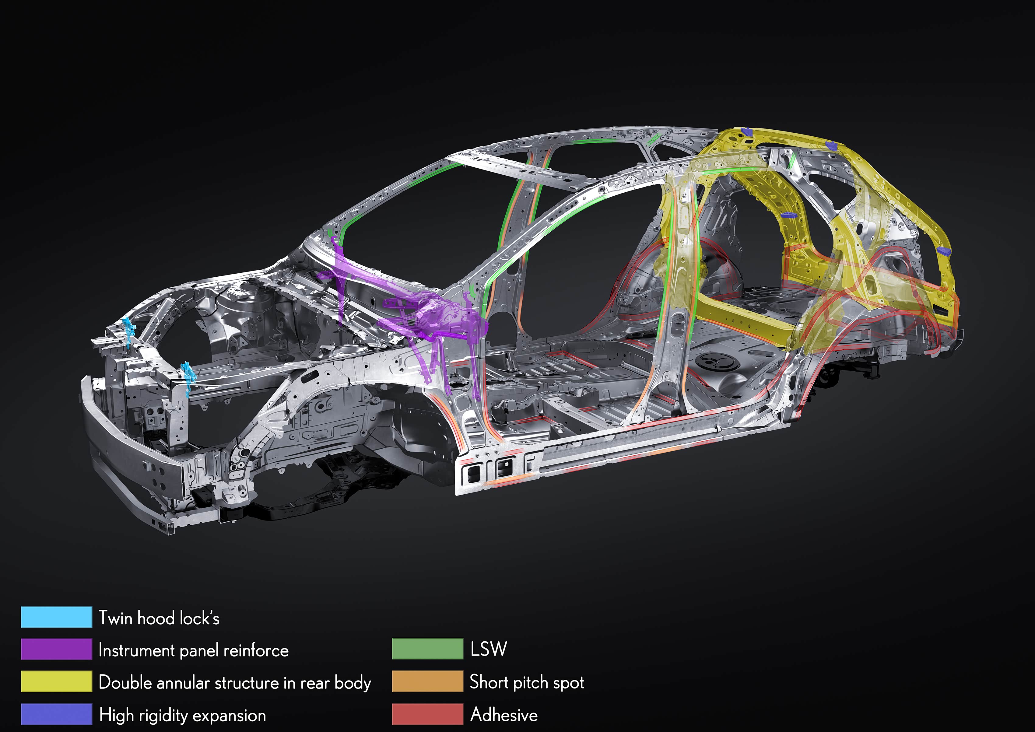 新NX整车基于丰田的TNGA- K平台打造,整车在多处进行了结构加强,大量使用了1180兆帕和1470兆帕高强度钢,在增加车身刚度的同时,有效降低了车重。