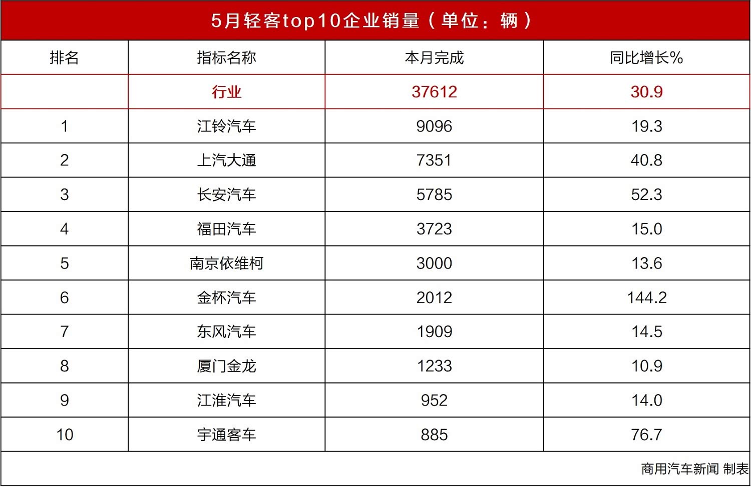 5月,前十名轻客企业全线实现增长。增幅高的达144%,低的也有10%。如果说原先月份欧系轻客保持增长,日系轻客偶有下降外,5月所有轻客企业的增长,足以说明轻客行业销量飘红。