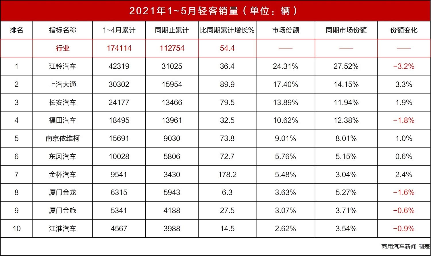 从累计销量增幅来看,前十名企业均实现增长,金杯涨幅最大,其次是大通和长安,南京依维柯和东风也实现了70%的增长。足以说明,今年前五个月,这五家企业市场表现优异。